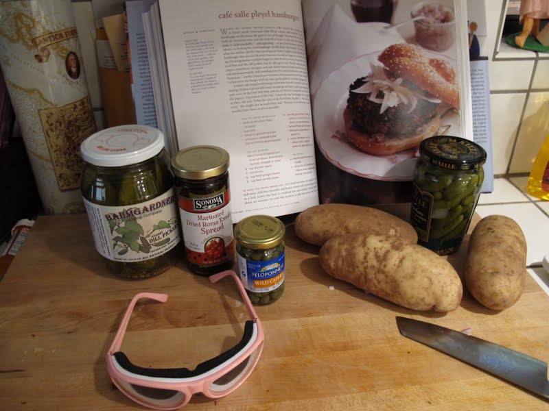 This week’s selection is “Cafe Salle Pleyel Hamburger.” This recipe has garnered much favorable attention, and reputedly makes the best hamburger in Paris. The reviews and commentary made us cautiously eager to see what a sinfully delicious hamburger would be like. I say “cautious” because both my companion and I like the “simple is better” approach. In fact, he valiantly lobbied against the cornichons and capers, but we eventually settled for the recipe as presented in Around My French Table by Dorie Greenspan.