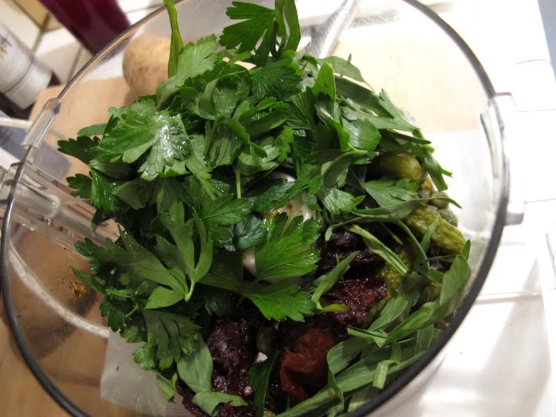 The foundation for this recipe is the onion marmalade that provides a ketchup/mustard substitute and subtle, caramelized onion flavor and texture. But, in general, the recipe reminds me of a meatloaf preparation. Oil-soaked sun dried tomatoes are drained and chopped and added to a mini-food processor with capers, fresh parsley, tarragon and cornichons. It is the equivalent of putting all your condiments and garnishes together, mixing them up and adding them to the meat. This combination creatively eliminates the need for the traditional egg and bread crumb mixture used to bind the patties (or the meatloaf). Because capers and cornichons are participants, I was a little light on the salt and pepper and this was reflected in the final result. If you try this at home, don’t be as cautious as I was when seasoning with salt and pepper.