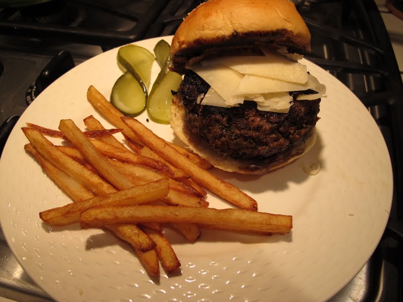 The meat patties held up well when cooked in the cast iron pan. No breakage! Three minutes per side is probably enough for medium-rare sirloin burgers, but we cooked the sirloin/chuck/brisket meat patties about thirty seconds longer on each side for the same doneness. The hamburger is adorned with shaved parmesan cheese curls that add an element of sophistication in appearance and are a nice departure from the standard slabs of American or cheddar cheese. We used sesame seed buns, and they worked just fine. But we really wanted something more interesting, like a tasty brioche bun, to compliment this fashionable recipe.