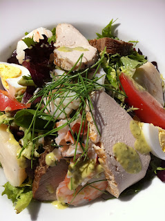 I had been dreaming about the Crazy Cobb Salad since my last visit. You probably think this does not sound very original and why would I be raving about gourmet food and then order a salad? But this is not an ordinary Cobb salad; it is a Crazy Cobb Salad filled with Lobster, Chicken, Scallops, Shrimp, Smoked Pork, and Baby Vegetables and lightly dressed with a Creamy Tarragon Dressing. When the Mamas and the Pappas wrote “California Dreamin’,” they may have been thinking about a salad just like this one. The Crazy Cobb Salad is as Southern California as the Beach Boys, roller blading along the Strand and Venice Beach. I can almost smell the salt water as I write these words. Yum!