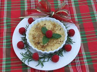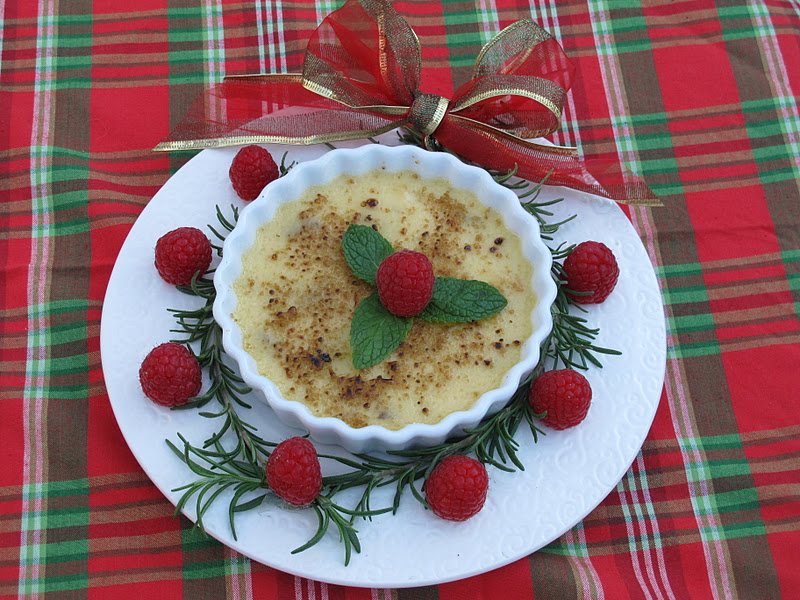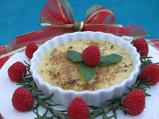 In the holiday spirit, I adorned our Crème Brûlée with a rosemary wreath and fresh raspberries masquerading as Christmas ornaments. To make the rosemary wreath, take two rosemary branches, approximately 7 inches each, tie together at the top with a ribbon, and the bottom can be stapled or taped together and covered with a raspberry ball to hide the tape/staple. The holly in the center is represented by 3 mint leaves and a raspberry. Quite a festive holiday dessert!